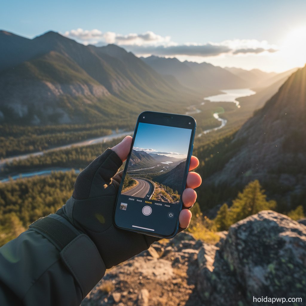- Chụp cận cảnh màn hình iPhone 16e đang hiển thị hình ảnh sống động về thiên nhiên, với điện thoại được đặt trên nền gỗ mộc mạc và vài chiếc lá khô xung quanh.